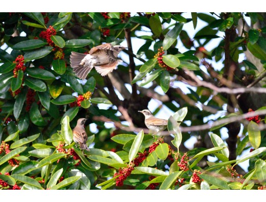 ツグミの群れがタラヨウの実を争うように食べていました。