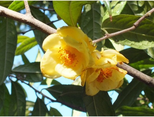 キンカチャ(金花茶)(Camellia chrysantha) ツバキ科 カメリア属 花期、1~3月 樹高、2~3m 中国広西省南部に自生し、日本へは1980頃、花径4~5cm、花色は黄色で、八重ラッパ咲き、小輪。