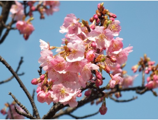 カワヅザクラ(河津桜) (Prunus lannesiana Kawazu-zakura) バラ科 サクラ属 花期、2~4月 樹高、5~10m 撮影日:2016年2月14日 場所:大阪市 長居公園