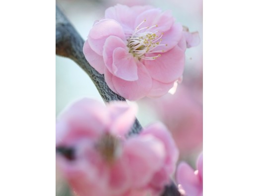 ミルキーピンクの花――「枝垂れ梅」 長居植物園、大池北側にて。