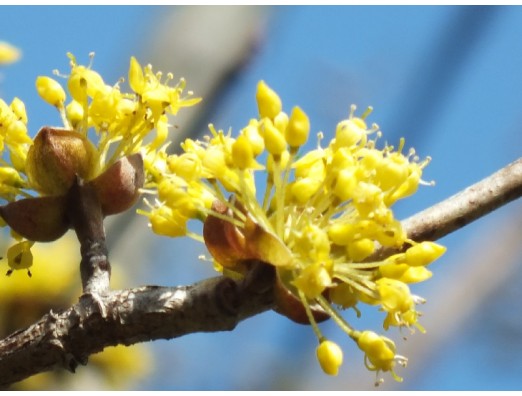 サンシュユ(山茱萸)(Cornus officinalis) 別名、ハルコガネバナ(春黄金花)、アキサンゴ(秋珊瑚) ミズキ科 ミズキ属 花期、3~4月 樹高、3~5m まだ新葉が開く前に黄色い花を沢山咲かせる。秋にはグミのように実が赤く熟し食べられます。