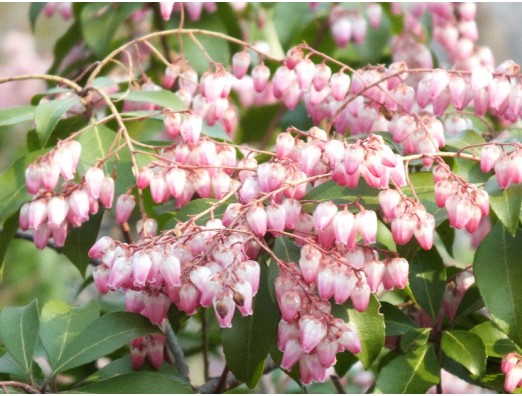 ベニバナアセビ(紅花馬酔木)(Pieris japonica) ツツジ科 アセビ属 花期、3~4月 樹高、50~100cm常緑低木 薄紅、白色の壷形の花をいっぱい咲かせる、花冠、6~8mm。