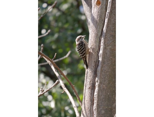コンコンと言う音でふり返ったら、キツツキがいました。 コゲラです。多分。 幹に2,3個穴が開いていました。