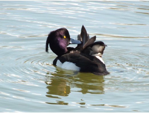 キンクロハジロ(金黒羽白)(Aythya fuligula) 雄 カモ目 カモ科 全長、40~47cm 特徴:後頭部に冠羽を持ち、雄のほうが長く腹と脇、翼の一部が白色で他は黒い。嘴は青灰色で先が黒く、目は黄色。雌は体の上面は黒褐色で、脇は褐色で淡い色の横斑がある。腹は白い。