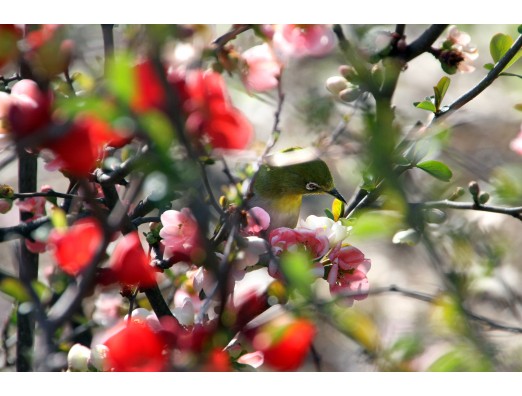 木瓜の花にメジロが来ていました。 すばやくて、また木瓜の花が邪魔して メジロ撮影は苦労しましたが 愛嬌のある姿が撮れて満足しています