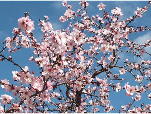 アーモンド(Prunus amygdalus) バラ科 サクラ属 花期、3~4月 樹高、2~8m 地中海地方原産、桃に似た白またはピンクの花が咲く。実は小さな桃やスモモに似た形の実で中の種がアーモンドになる。