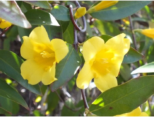 カロライナジャスミン(Gelsemium sempervirens) マチン科 ゲルセミウム属 花期、4~6月 樹高、30cm~6m カロライナ州原産で、ジャスミンの香りがするのでこの名がついた。