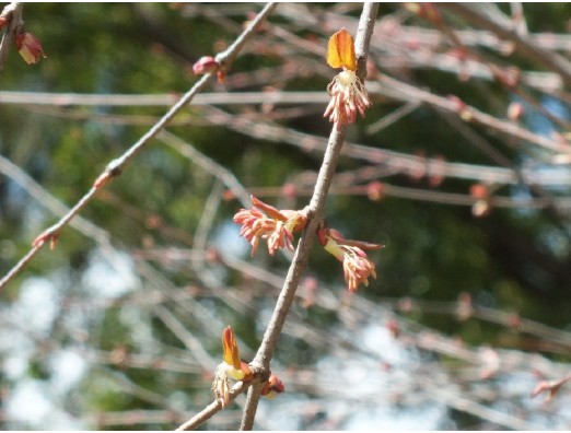 カツラ(桂)雄(Cercidiphyllum japonicum)雄花 別名、コウノキ(香の木) カツラ科 カツラ属 花期、3~5月 樹高、30m 桂は雌雄異株で、葉が出る前に花を付け、花には花弁もガクも無く雄しべの赤い葯(ヤク)だけが目立つ。