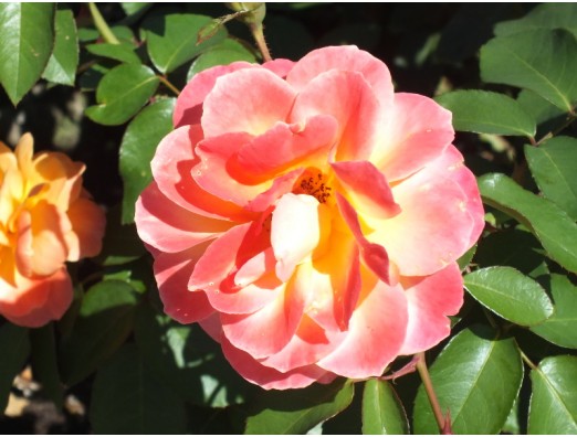 スヴニール・ダンネ・フランク(Rosa Souv d'Anne Frank) 「別名、アンネのバラ」 ベルギー1960年 パラ科 バラ属 花期、四季咲き 樹高、約1m 花径、6~8cm 花色、半剣弁抱え咲き橙から赤に変。中輪、中香。 2014年10月19日 長居公園