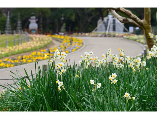ニホンズイセンとイルミネーションの雪だるまさんです。