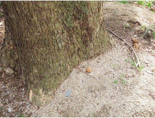 名前は忘れましたが、一緒に写ってる大木が落とした種子です。 見た目は胡麻団子か大きなサクランボのような、でも強く押すと崩れてタンポポの種子のようにばらけて風に乗って飛びます