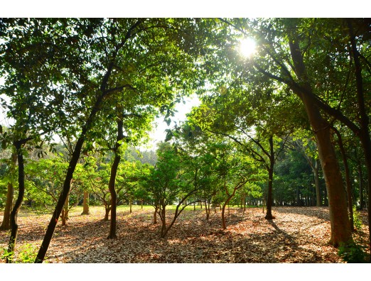 昼間のツバキ園は、日差しが樹木の間に差し込んで落葉を照らす、 夢見るような美しい光景でした。
