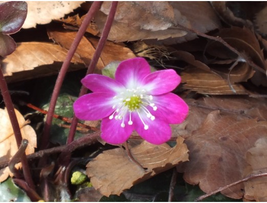 ユキワリソウ(雪割草)(Hepatica nobilis var. japonica) 別名、ミスミソウ(三角草)、スハマソウ(洲浜草) キンポウゲ科 ミスミソウ属 花期、3~4月 草丈、10~20cm 花色は桃色、青紫、白色で花径、3cm。