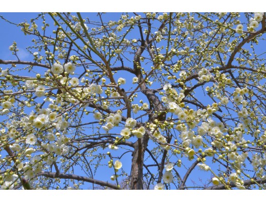 澄んだ青い空に合う白い梅の花。