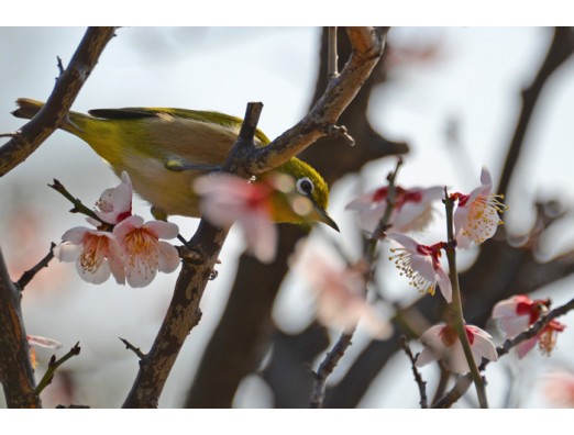 満開の白梅。そこへ運良くメジロさんが飛来してくれました。