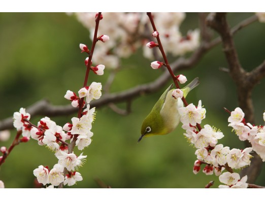 梅が満開、桜も咲きはじめました。 梅に桜にとメジロさんは大忙しです。