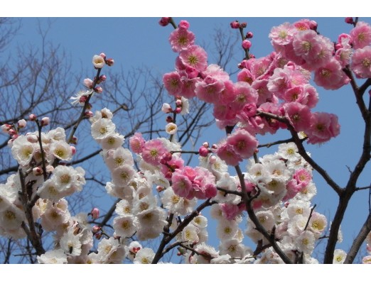 一本の木に白とピンクの花が!