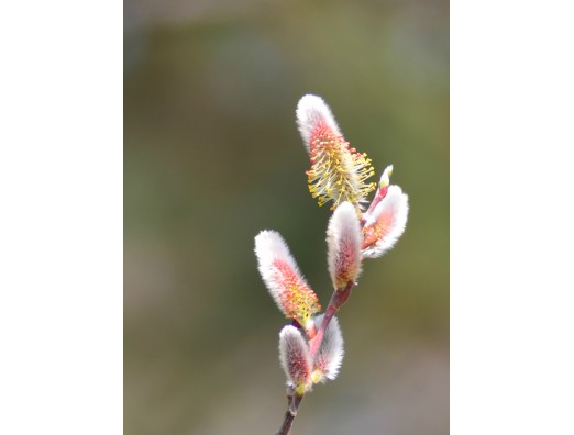 フリソデヤナギ、銀色の毛に包まれた大きな芽から花が咲いてます。