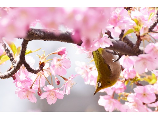 満開の河津桜とメジロのコラボが撮りたくて、長居公園に、広場に着くと、満開の河津桜とメジロが待っていてくれました。桜の蜜を吸っていたメジロが蜜から嘴を離した瞬間を撮りました
