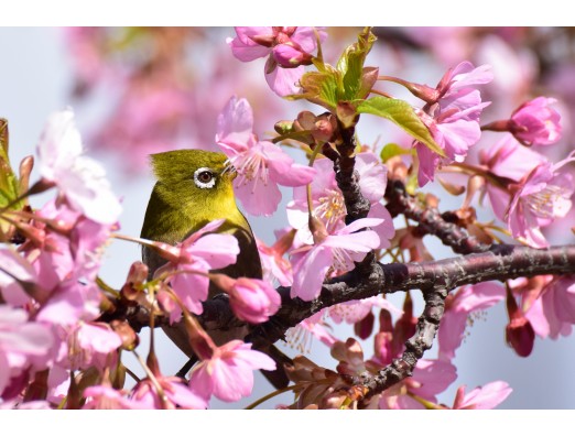 雪が振ってたのに公園に着くと晴天に、でもこの日は風が強かったので、蜜を吸うメジロの毛が逆だっていました