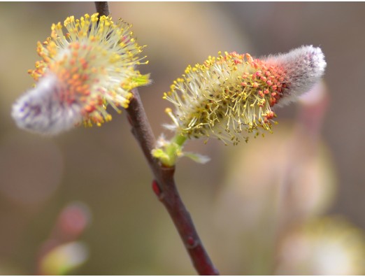 振袖柳、銀色の毛に包まれた大きな芽から花が咲く。