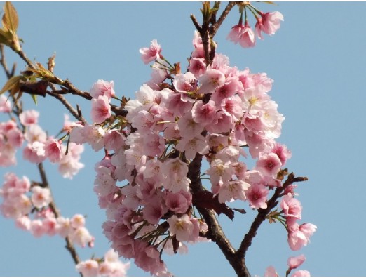 オオカンザクラ(大寒桜)(Prunus × kanzakura Oh-kanzakura) 別名、(安行寒桜) バラ科 サクラ属 花期、3月下旬 樹高、5~10m ソメイヨシノより一足早く咲く。カンザクラよりも寒さに強く、花は中輪、一重咲きで淡紅色。