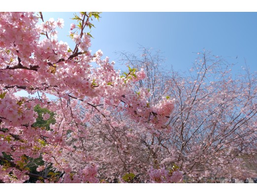 春です、青い空と河津桜と十月桜のコラボです。