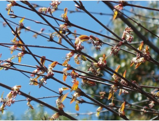 カツラ(桂)(Cercidiphyllum japonicum)雄花 別名、コウノキ(香の木) カツラ科 カツラ属 花期、3~5月 樹高、30m 桂は雌雄異株で、葉が出る前に花を付け、花には花弁もガクも無く雄しべの赤い葯(ヤク)だけが目立つ。