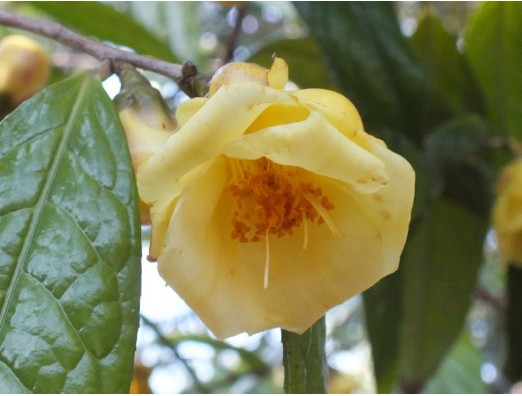 (椿)、キンカチャ(金花茶)(Camellia chrysantha) ツバキ科 カメリア属 花期、1~3月 樹高、2~3m 中国広西省南部に自生し、日本へは1980頃、花径4~5cm、花色は黄色で、八重ラッパ咲き、小輪。