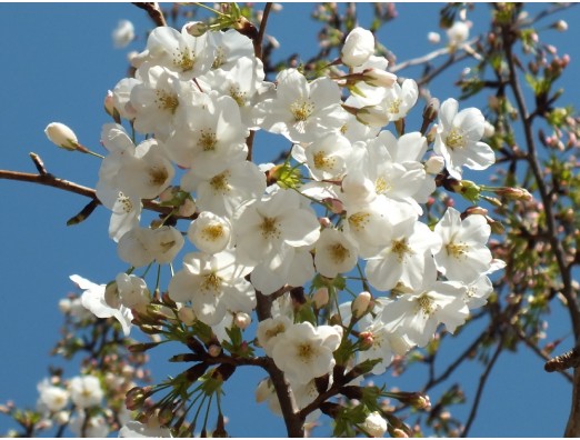 ニオイザクラ(匂桜)(Cerasus serrulata Nioi-zakura) 別名、フジザクラ(富士桜) バラ科 サクラ属 花期、3~4月 樹高、3~8m オオシマザクラの重弁化したもので、花弁に切れ込みが有り少ししわが有る、花弁5枚の白い花。