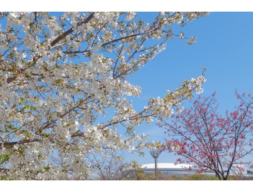 春の日差しに自由広場のニオイザクラも見ごろ。 広場からは、子供たちの歓声が聞こえてきました。