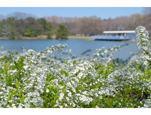 ユキヤナギの白と大池湖面の青とのコントラストがとてもきれいです。