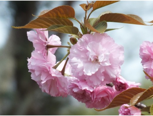 サクラ、カンザン(桜・関山) (Prunus lannesiana Wils. cv. Sekiyama) 別名、セキヤマ(関山) バラ科 サクラ属 花期、4~5月 樹高、5~15m オオシマザクラ系の里桜の代表種のひとつ。花は濃いピンク色で八重の大輪、径5~6cmの花が咲く。