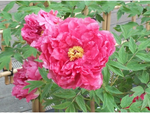 ボタン(牡丹)(朝日港・あさひみなと)(Paeonia suffruticosa) ボタン科 ボタン属 花期、4~5月 樹高、50~300cm 中国原産で、奈良時代に渡来したらしい、花径、15~25cm、花色は桃、青紫、赤、橙、白、黄色。芍薬は多年草。