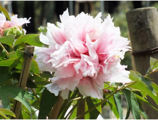 ボタン(春日山・かすがやま)(Paenia suffruticosa Kasugayama) ボタン科 ボタン属 花期、4~5月 樹高、1m以上 花径、18~25cmの大輪で千重の抱え咲き。花色は淡桃色、咲き出しは桜色より色濃く満開後桜色に。