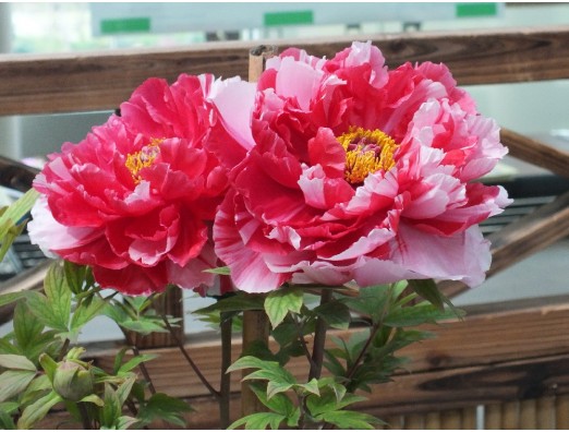 ボタン(牡丹)(島錦・しまにしき)(Paeonia suffruticosa shimanishiki) ボタン科 ボタン属 花期、4~5月 樹高、1~1.5m 花径、15~25cm 花色、紅白の絞で出方は固定していない。千重咲き中輪。