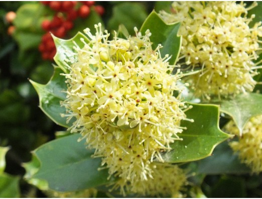 ヒイラギモチ(柊黐)(Ilex aquifolium) 雄花 別名、クリスマスホーリー、ヒイラギモドキ(柊擬き) モチノキ科 モチノキ属 花期、5~6月 樹高、40~500cm 葉は四角張った長楕円形の先端に刺が有り古は葉は丸い。雌雄異株でも雄にも実が付く。