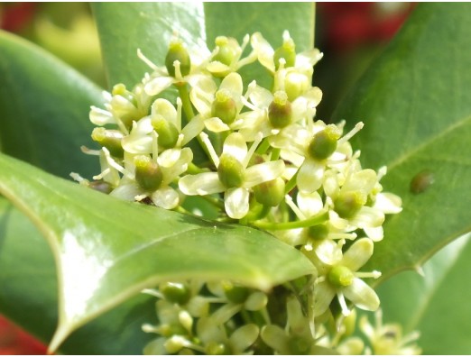 ヒイラギモチ(柊黐)(Ilex aquifolium) 雌花 別名、クリスマスホーリー、ヒイラギモドキ(柊擬き) モチノキ科 モチノキ属 花期、5~6月 樹高、40~500cm 葉は四角張った長楕円形の先端に刺が有り古は葉は丸い。雌雄異株でも雄にも実が付く。