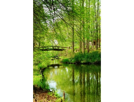 どこか外国の水辺の風景のよう。水面に写る小橋と木立が美しいです。