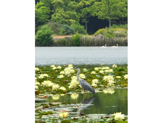 スイレンが咲く池の真ん中にアオサギ が凛々しい姿、、遠方に悠々と泳ぐ白鳥、撮らずにいられない一枚でした。