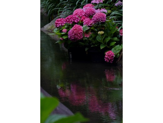 渓流沿いのあじさいとみなものコントラストが見事です。