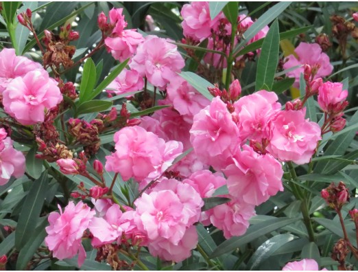 桃色八重の「キョウチクトウ(夾竹桃)」 八重桜と見まごうような大輪の美しい花を咲かせています。 木はバックヤード側にあるので柵越しで見ることができます。