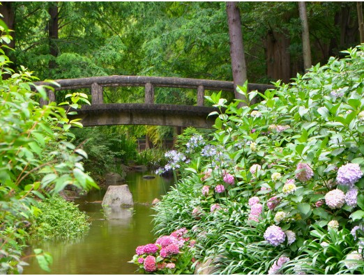 渓流沿いに咲き誇る色とりどりのあじさい、美しい風景です。