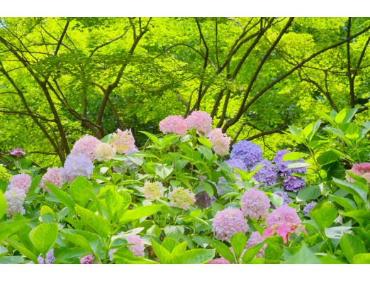 青もみじを背にやさしい彩りのアジサイ、 梅雨の時期だけの楽しみです。