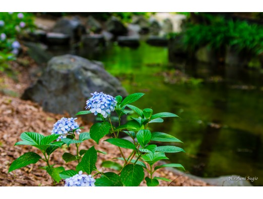 紫陽花園から大池にかけて流れる小川のほとりに咲く紫陽花。お気に入りの場所です。