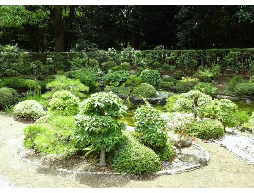 池泉回遊式庭園のミニチュア。 この日は滝も見えたので、後ろの黒い林を借景だと決めて撮って見たがやっぱり物足りない。