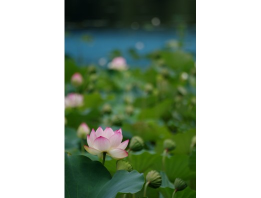 台風の翌日、大池の湖面に一文字橋の青色が映えきれいでした。