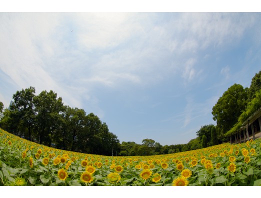 梅雨の晴れ間の昼下がり、太陽が真上から照りつけ真夏も間近。 雲が薄くかかった空の青とひまわりの黄色のコントラストがきれいでした。