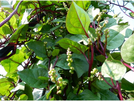 ツルムラサキのかわいい花。葉も茎もしっかりと濃い色でとても美しい。