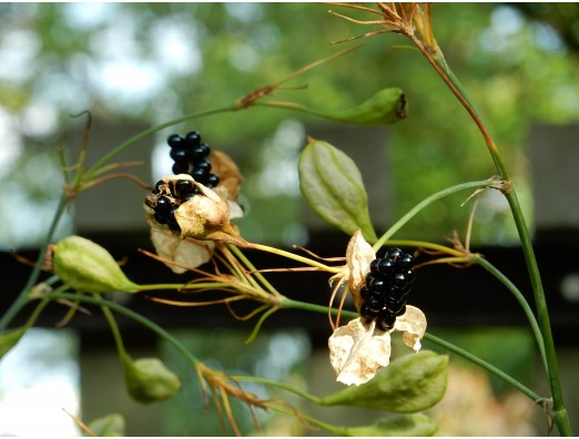 射干玉(ぬばたま)。鮮やかなオレンジ色のヒオウギからつやつやとした真っ黒の実ができていました。